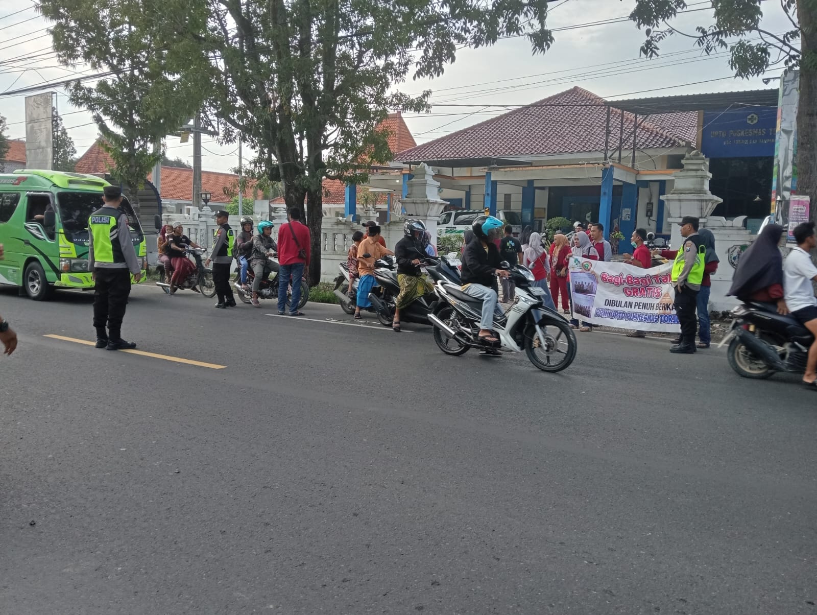Kanit Binmas Polsek Torjun Aipda Fauzi Imroni bersama anggota tampak mengamankan pembagian takjil pegawai Puskesmas Torjun pada kamis (20/03/2025) sore.