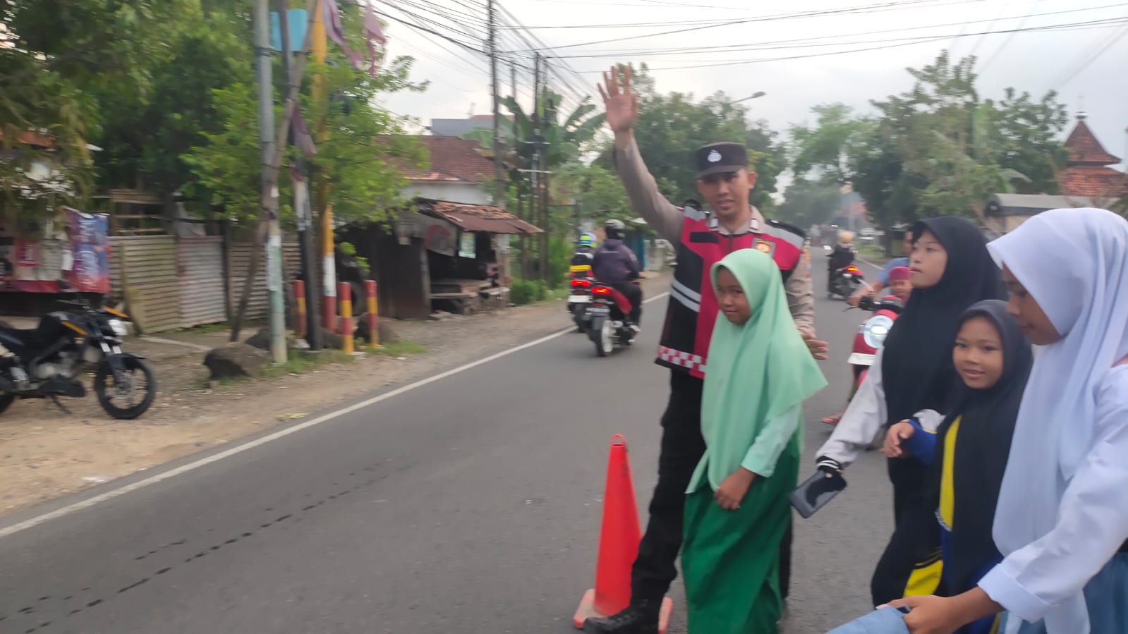 Kamis (18/12/2025) Bripka Budi Cahyono melaksanakan pengamanan dan pengaturan arus lalu lintas di Simpang Dulang Torjun.