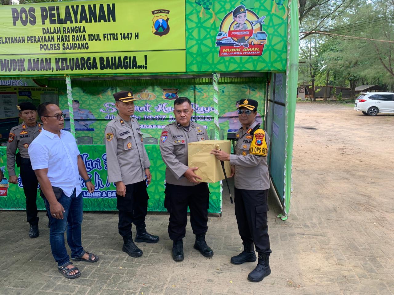 Dalam kunjungan tersebut, AKBP Hartono menyerahkan sejumlah paket bingkisan kepada petugas jaga yang terdiri dari personel gabungan TNI-Polri, Pemerintah Kabupaten Sampang, serta mitra Kamtibmas. Bingkisan tersebut berisi berbagai kebutuhan logistik mulai dari makanan ringan, minuman penyegar, buah-buahan segar, hingga paket obat-obatan dan vitamin.