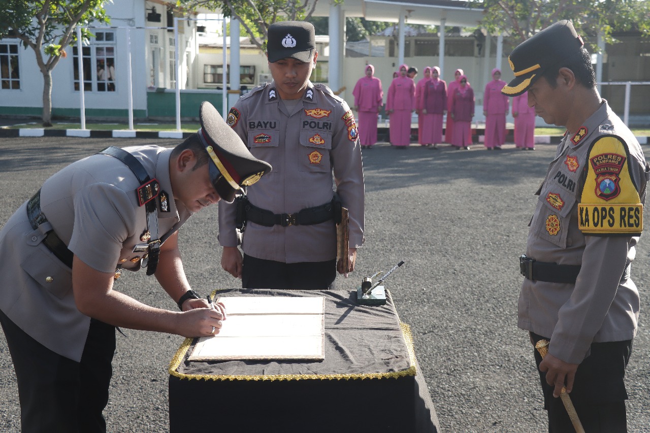 Upacara Sertijab dilaksanakan di lapangan apel Wira Manunggal Wicaksana Mapolres Sampang diikuti Wakapolres Sampang Kompol Dhany Rahadian Basuki, PJU Polres Sampang, Komandan Kompi 2 Batalyon D Pelopor Polda Jatim, Kapolsek Jajaran, perwira dan bintara Polres Sampang.