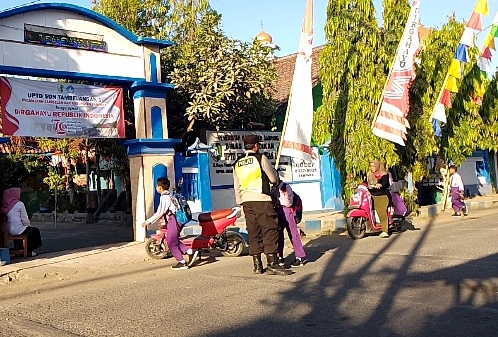 Sampang – Mengantisipasi terjadinya kecelakaan lalu lintas di pagi hari, personil Polsek Tambelangan kesatuan Polres Sampang Polda Jatim melaksanakan pengamanan dan pengaturan arus lalu lintas di beberapa sekolah dan simpul jalan di Kecamatan Tambelangan.