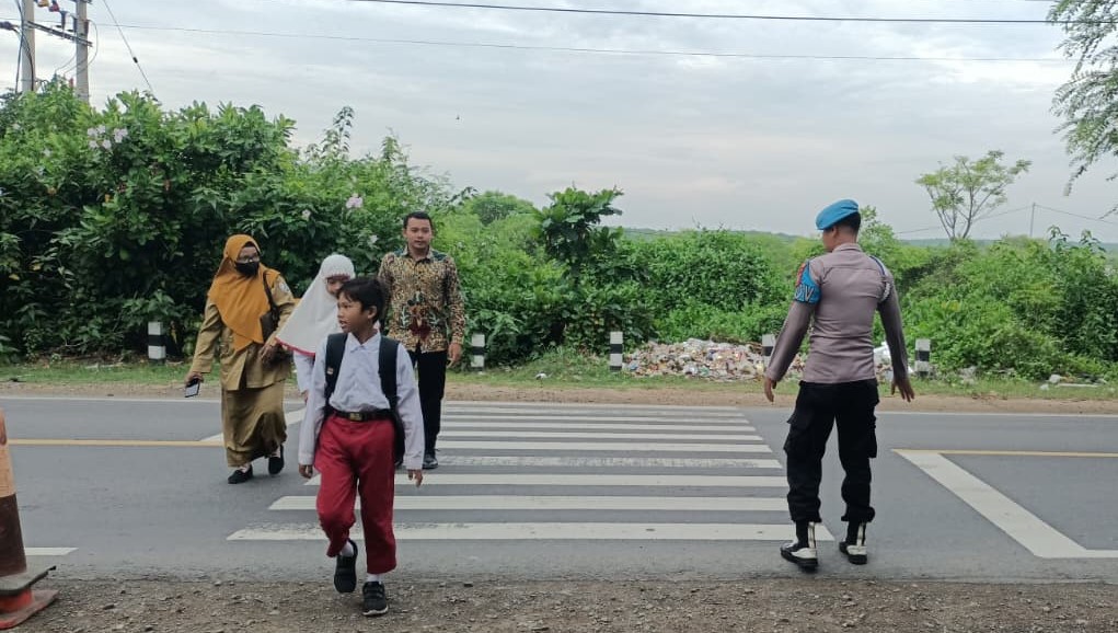 Sampang – Personil Polsek Camplong kesatuan Polres Sampang laksanakan penjagaan, Pengamanan dan Pengaturan arus Lalu Lintas di depan Sekolah Dasar SDN Taddan 2 Camplong, pada hari selasa (10/12/2025) pagi.