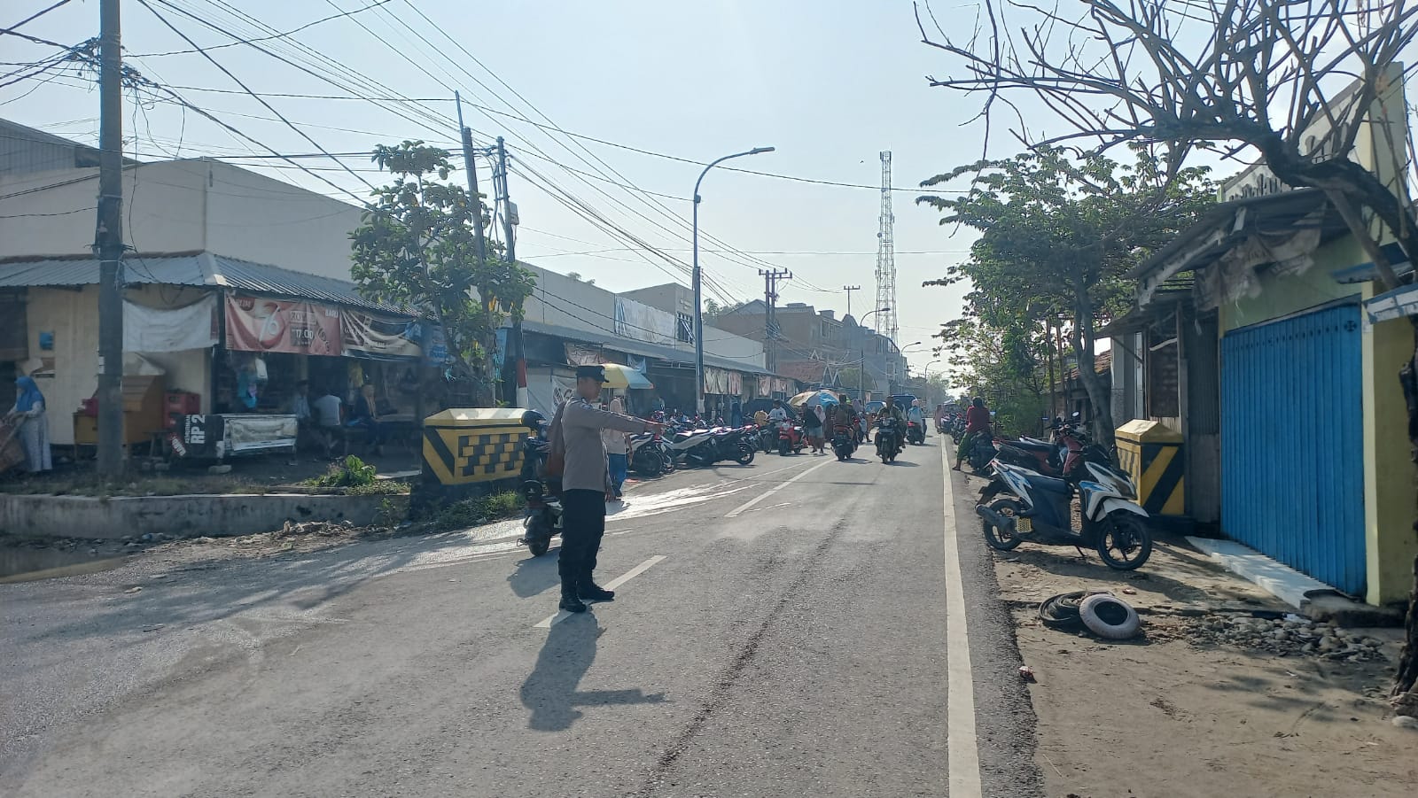 Anggota Polsek Pengarengan terlihat mondar mandir menyeberangkan masyarakat dan melakukan gatur di tengah keramaian.