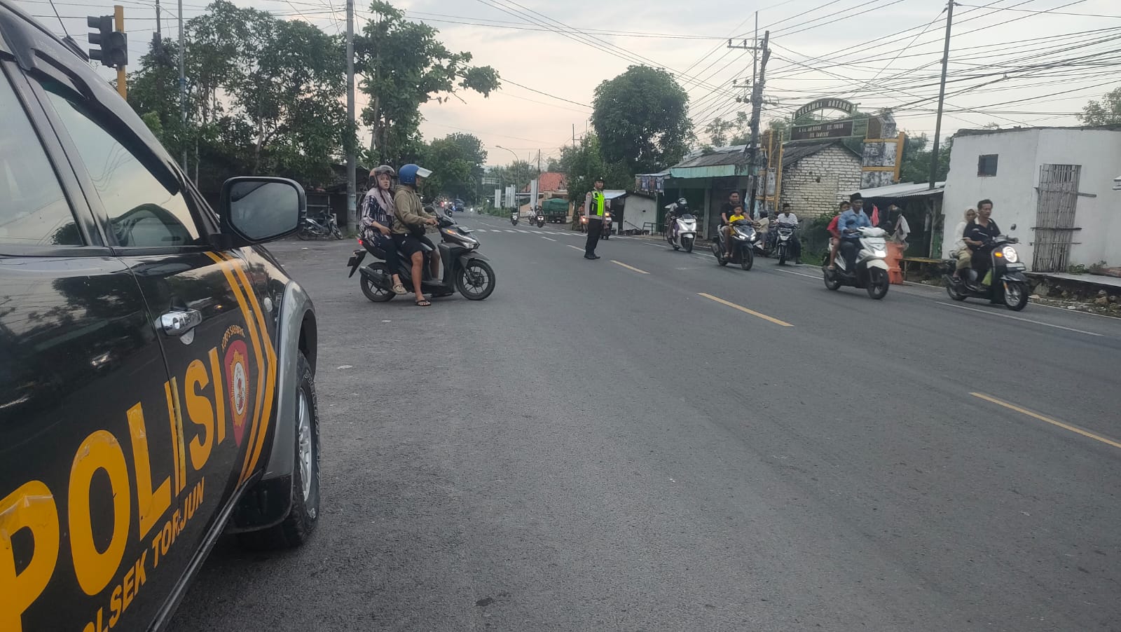 Kamis (03/04/2025) Aiptu Fauzi Imroni bersama Brigadir Hidayat Nur Wahid melaksanakan pengamanan dan pengaturan arus lalu lintas di Simpang Kristal Torjun.