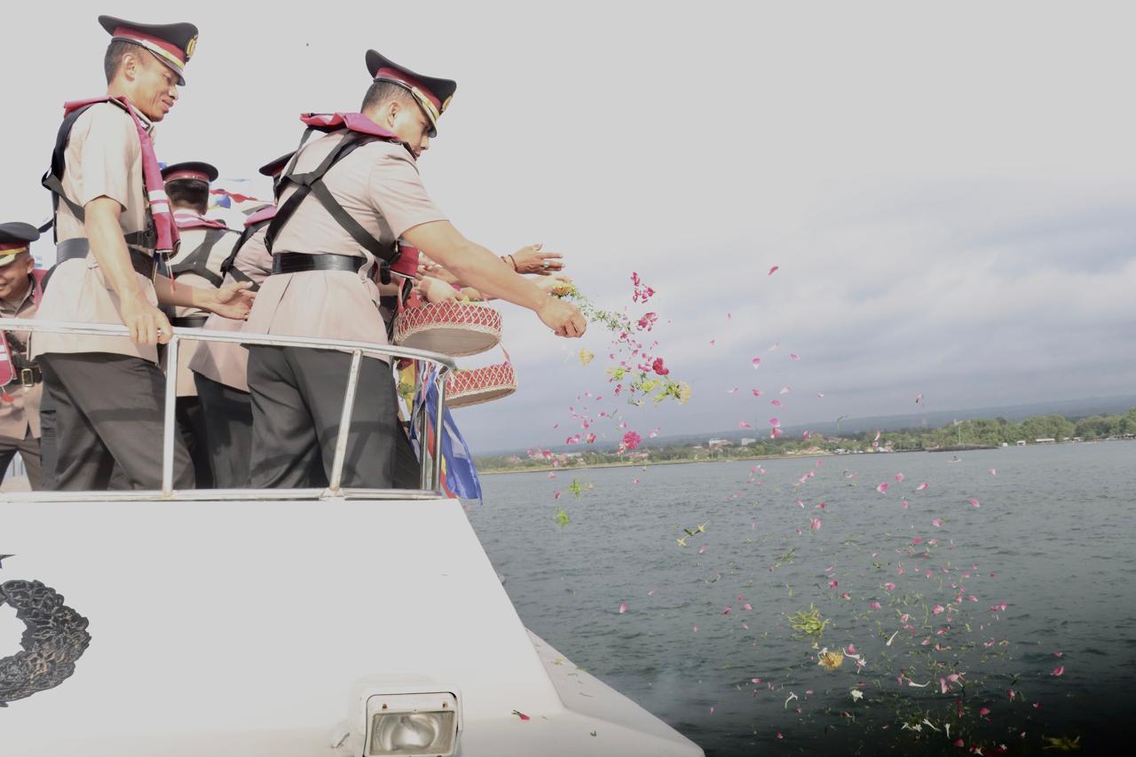 Dengan menggunakan kapal patroli milik Sat Polairud Polresta Banyuwangi, Kapolresta Banyuwangi bersama para Pejabat Utama (PJU) menyusuri perairan selat Bali untuk menaburkan bunga sebagai bentuk penghormatan kepada arwah para pahlawan yang gugur dalam tugas.