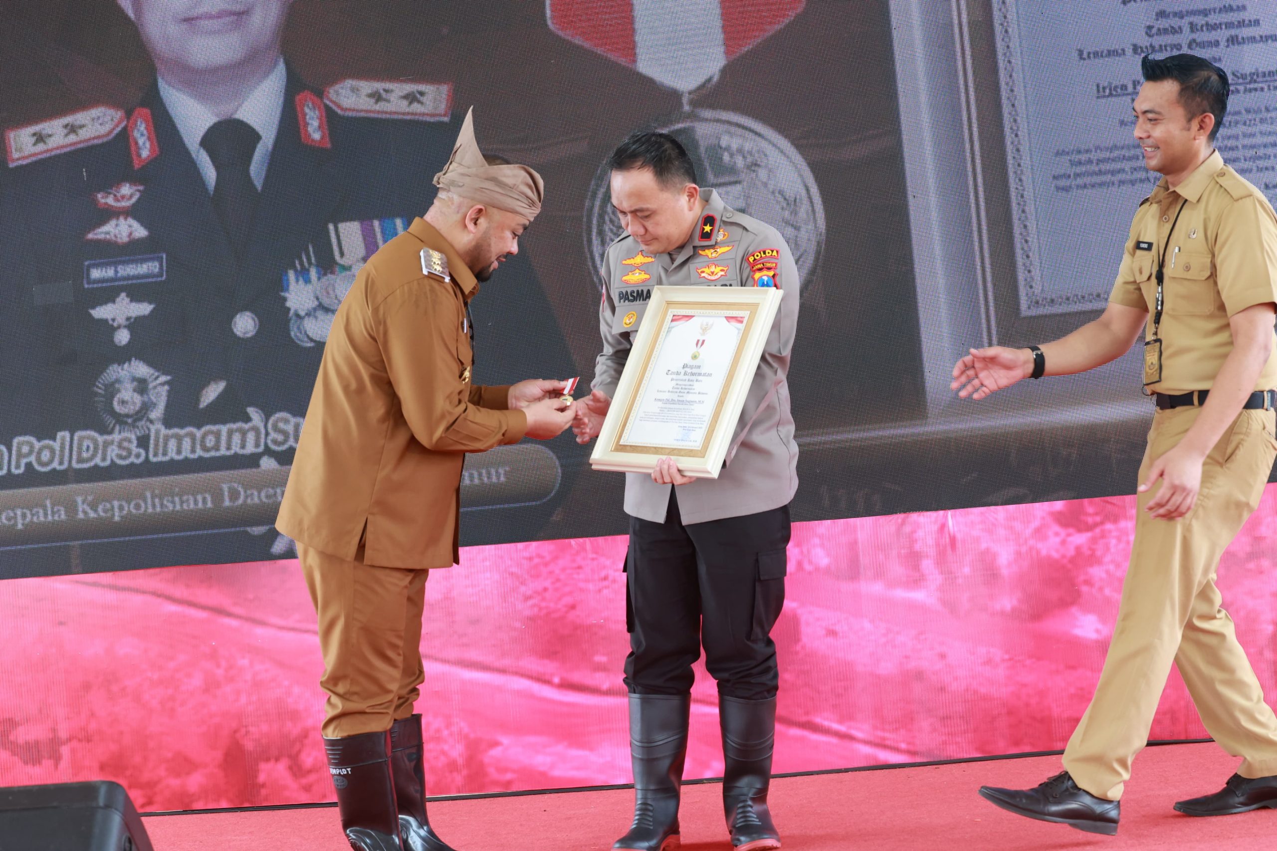 Penghargaan ini diberikan kepada Kapolda Jawa Timur ,Komjen Pol Imam Sugianto yang diwakili Wakapolda Jatim, Brigjen Pol Pasma Royce saat launching Program Penguatan Pangan Lestari, di Kota Batu, Senin (24/2).
