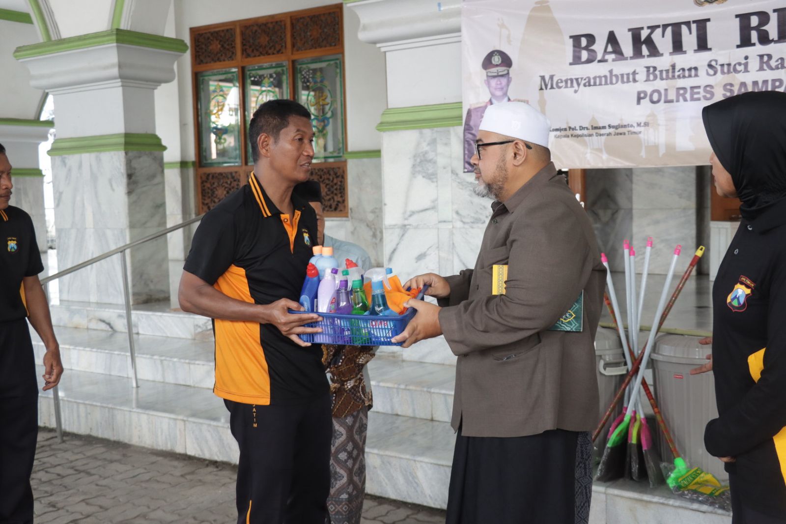 “Selain melaksanakan bakti religi dilingkungan masjid, kita juga menyerahkan paket alat kebersihan dan bantuan sosial lainnya kepada pengurus atau takmir masjid,” kata Kapolres Sampang AKBP Hartono.