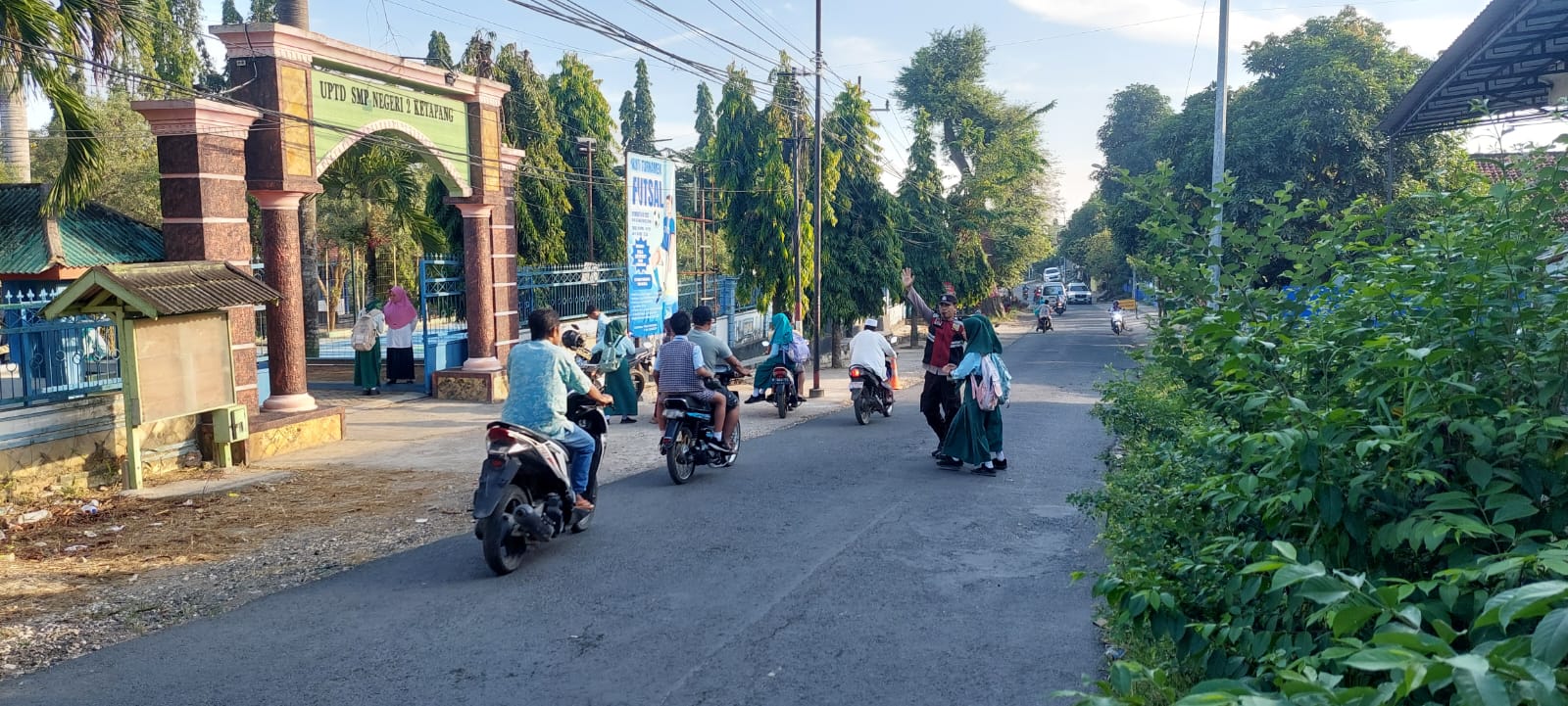 Seperti yang terlihat di jalan raya depan Unit Pelaksana Teknis Daerah Satuan Pendidikan Formal Sekolah Menengah Pertama UPTD SPF SMP 2 Ketapang, Aiptu Ibnu Sabil dan anggotanya membantu orang tua (wali murid) dan siswa-siswi menyeberang jalan menuju sekolah untuk menimba ilmu.