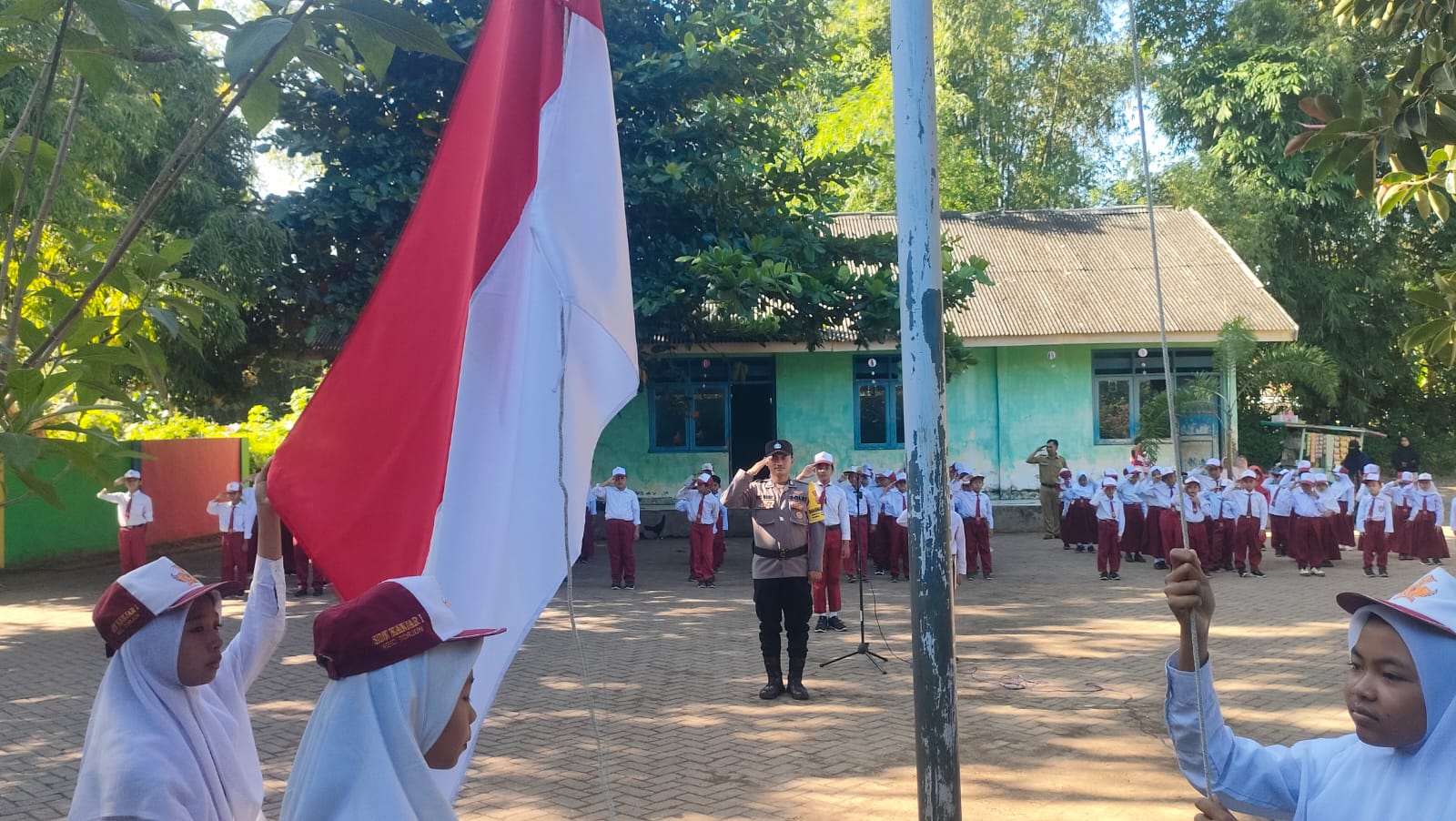 SAMPANG – Menjadi bagian dari program unggulan Police Goes to School, Bhabinkamtibmas Desa Kanjar, Brigpol Nor Wahid Rusdianto, bertindak sebagai Pembina Upacara dalam Upacara Bendera di SD Negeri Kanjar 1, Kecamatan Torjun, Kabupaten Sampang, Senin (02/02/2026) pagi.